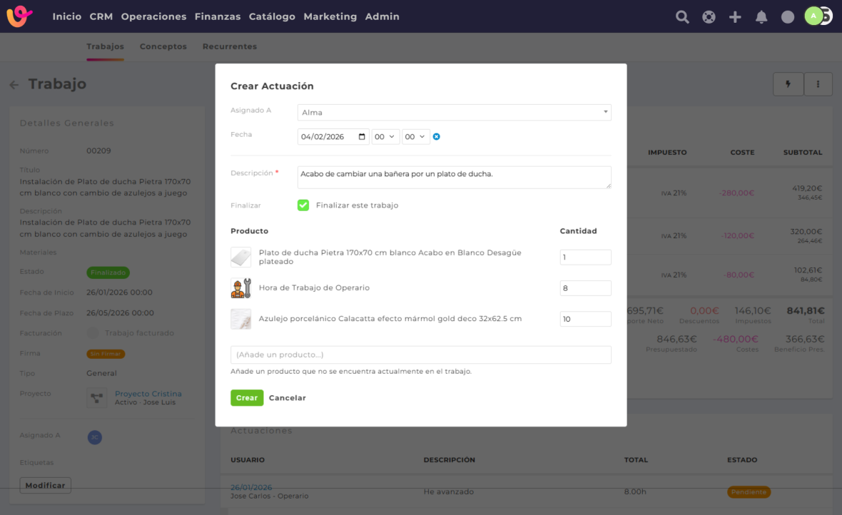 La segunda forma de crear las actuaciones en Vendomia es desde la ficha del trabajo. Esta opción está pensada para responsables de obra, encargados o administradores que desean crear o revisar actuaciones directamente desde los trabajos.