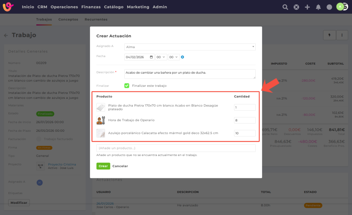 Los productos indicados suelen formar parte de los conceptos ya definidos en el trabajo según el presupuesto o la planificación, pero también es posible añadir nuevos productos si ha sido necesario.