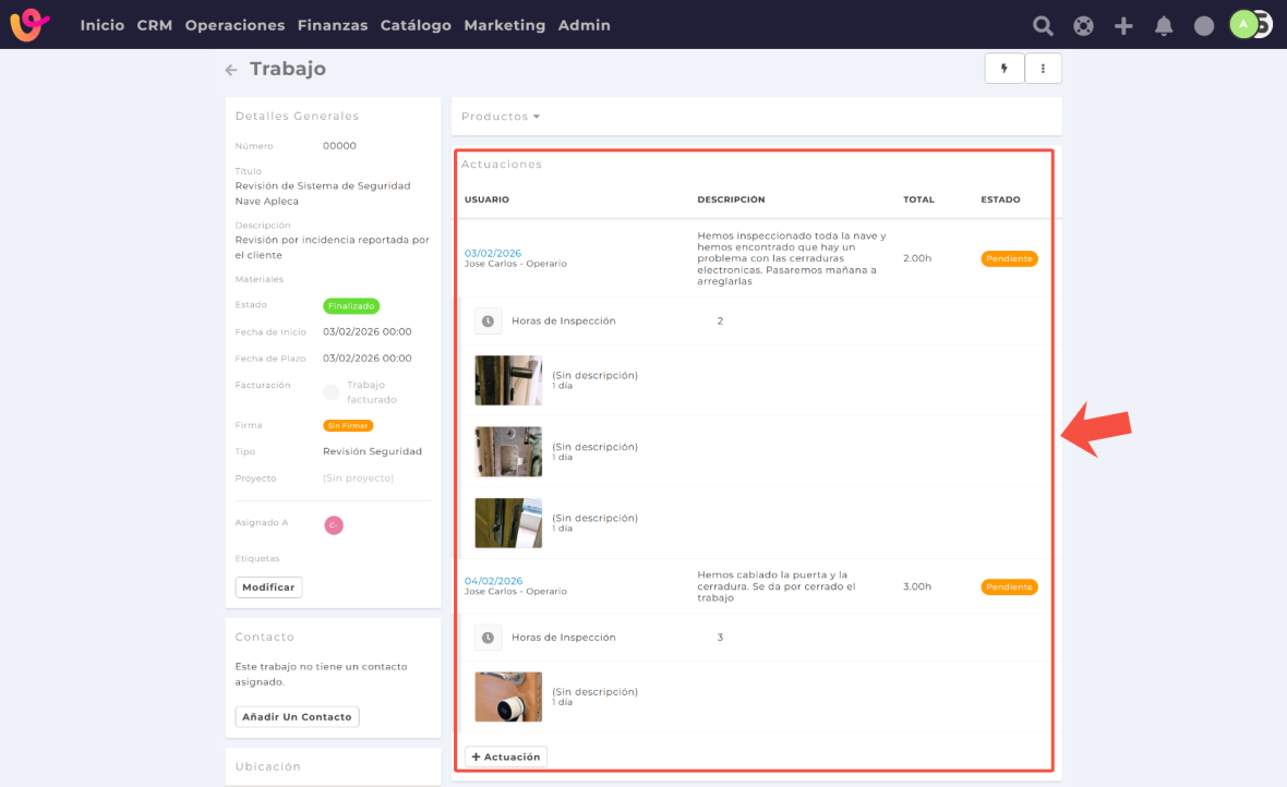En la imagen de arriba, puedes ver cómo se reflejan dos actuaciones en días distintos en un mismo trabajo. En ese caso, la primera actuación refleja la revisión de unas puertas y, la segunda, la instalación de una cerradura concreta.