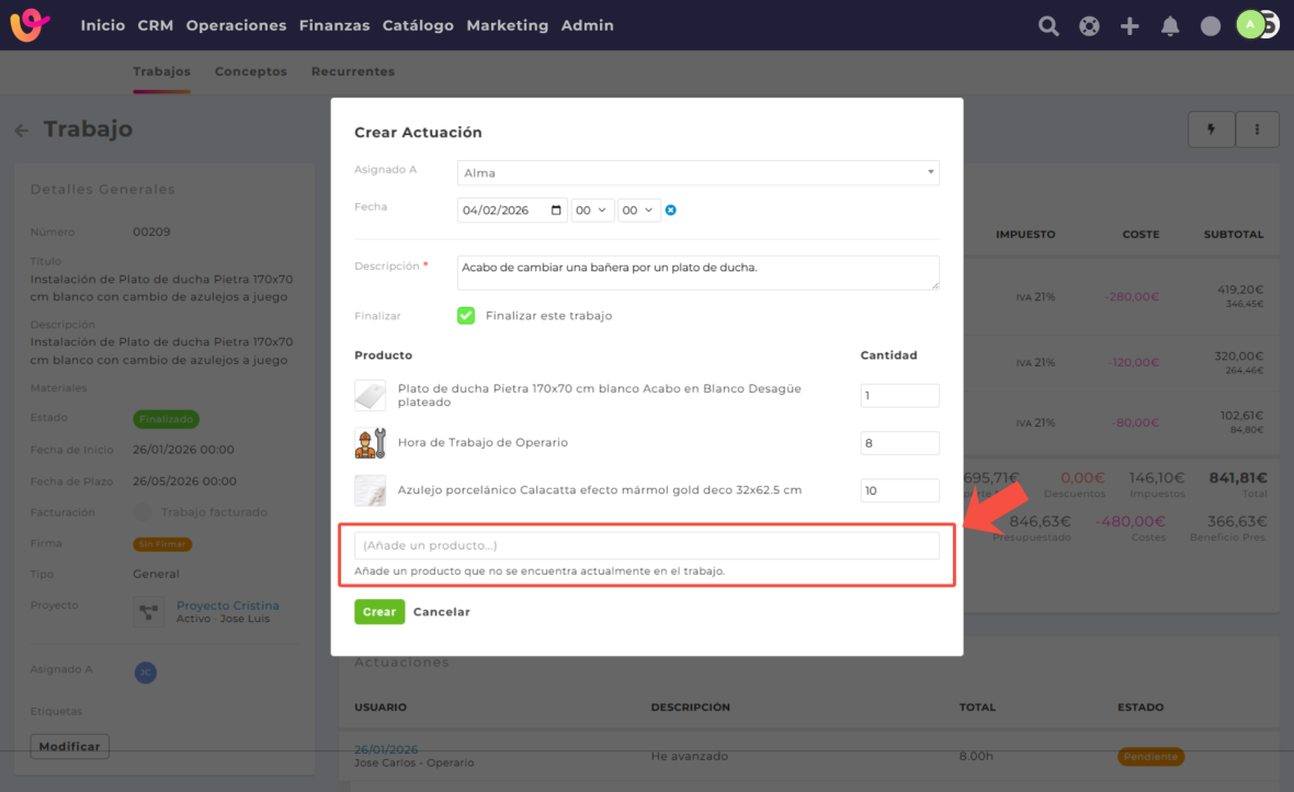 Durante la creación o modificación de una actuación, es posible añadir productos que no estaban previstos inicialmente en el trabajo.